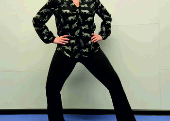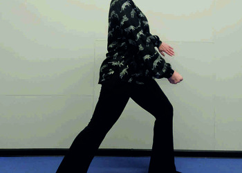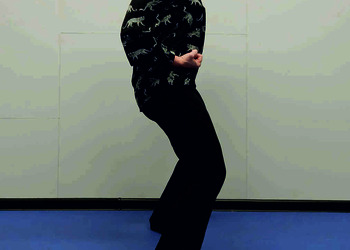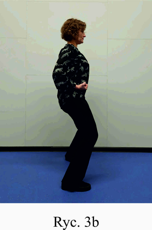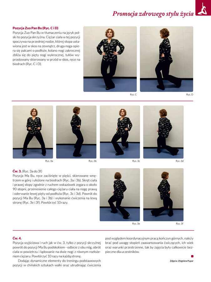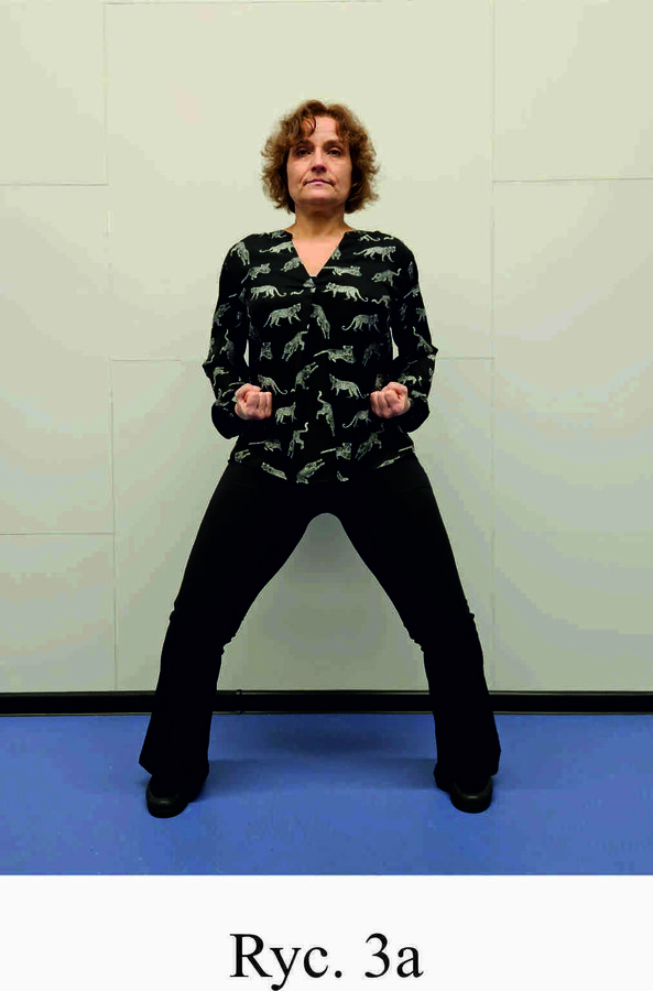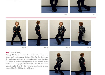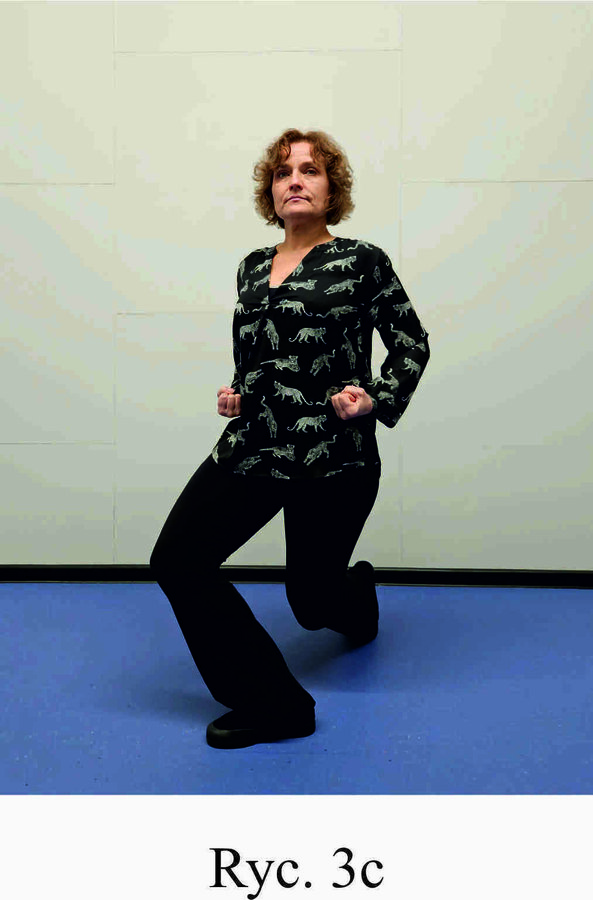 Pozycja Ma Bu, ręce zaciśnięte w pięści, skierowane wnętrzem w górę i ułożone na biodrach (Ryc. 3a i 3b). Skręt ciała i prawej stopy zgodnie z ruchem wskazówek zegara o około 90 stopni, przeniesienie całego ciężaru ciała na nogę prawą i oderwanie lewej pięty od podłoża (Ryc. 3c i 3d). Powrót do pozycji Ma Bu (Ryc. 3a i 3b) i wykonanie ćwiczenia na lewą stronę (Ryc. 3e i 3f). Powtórzyć 10 razy.