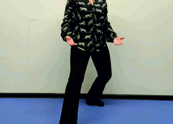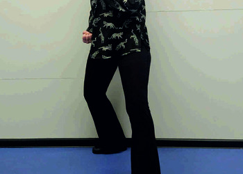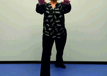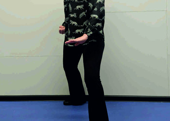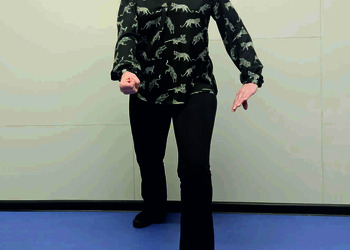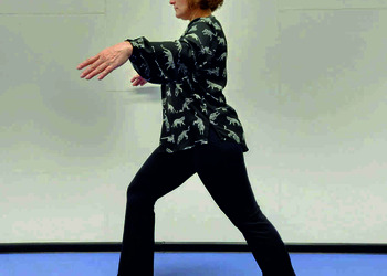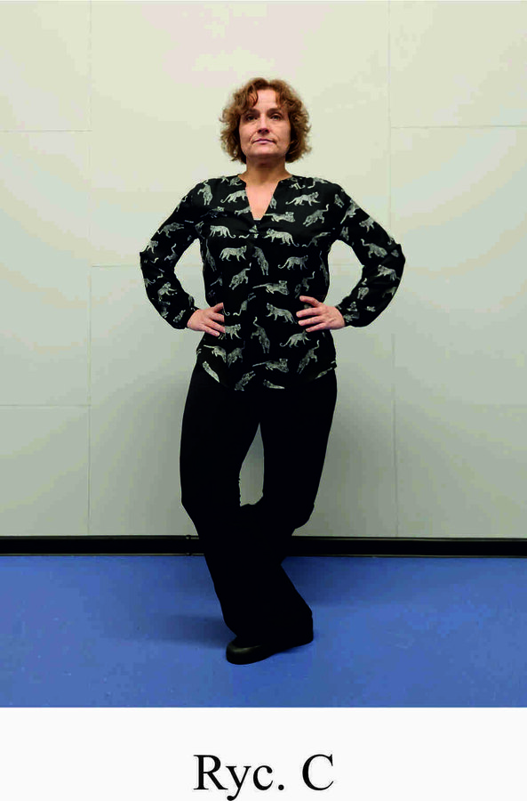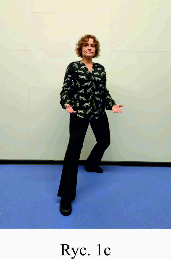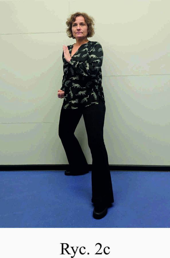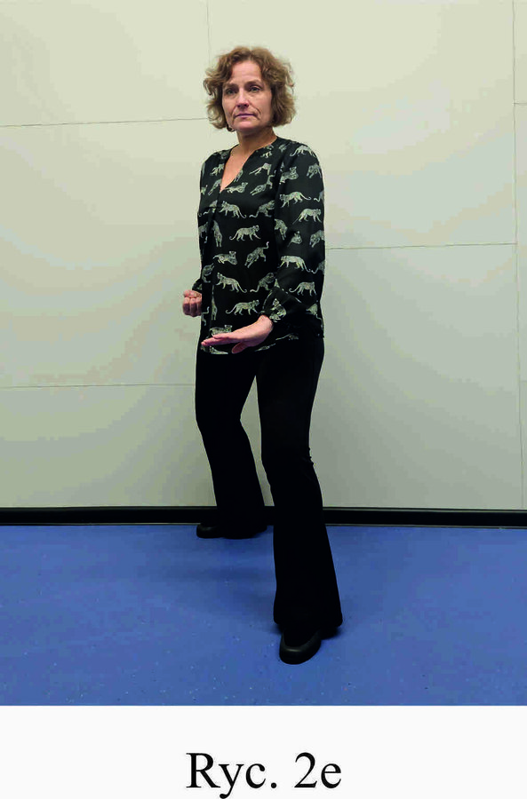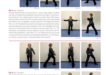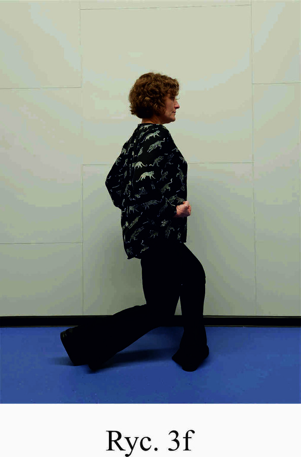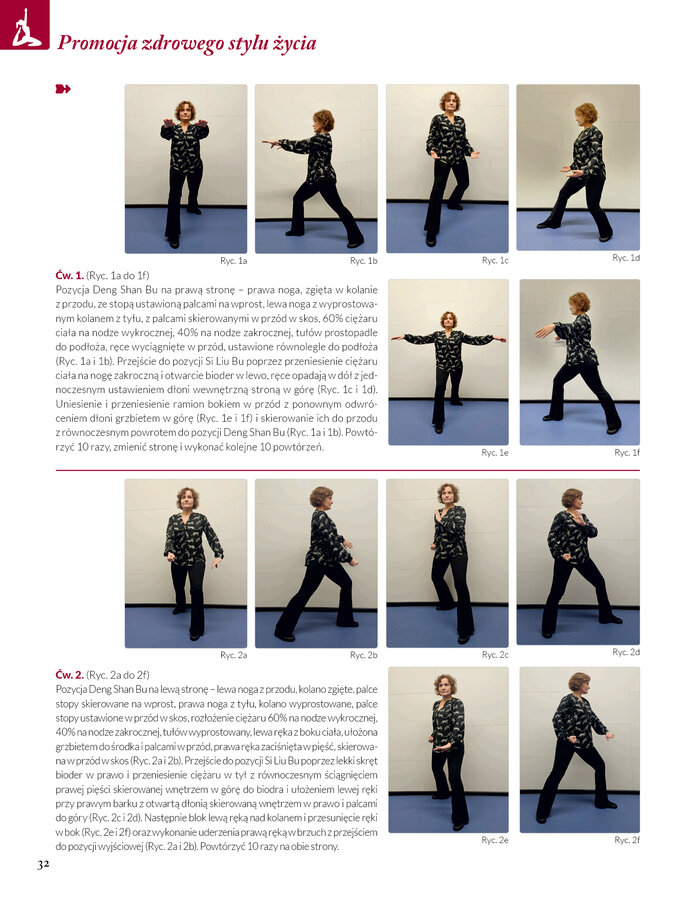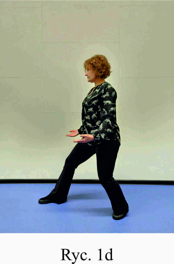 Pozycja Deng Shan Bu na prawą stronę – prawa noga, zgięta w kolanie z przodu, ze stopą ustawioną palcami na wprost, lewa noga z wyprostowanym kolanem z tyłu, z palcami skierowanymi w przód w skos, 60% ciężaru ciała na nodze wykrocznej, 40% na nodze zakrocznej, tułów prostopadle do podłoża, ręce wyciągnięte w przód, ustawione równolegle do podłoża (Ryc. 1a i 1b). Przejście do pozycji Si Liu Bu poprzez przeniesienie ciężaru ciała na nogę zakroczną i otwarcie bioder w lewo, ręce opadają w dół z jednoczesnym ustawieniem dłoni wewnętrzną stroną w górę (Ryc. 1c i 1d). Uniesienie i przeniesienie ramion bokiem w przód z ponownym odwróceniem dłoni grzbietem w górę (Ryc. 1e i 1f) i skierowanie ich do przodu z równoczesnym powrotem do pozycji Deng Shan Bu (Ryc. 1a i 1b). Powtórzyć 10 razy, zmienić stronę i wykonać kolejne 10 powtórzeń.