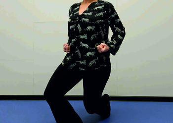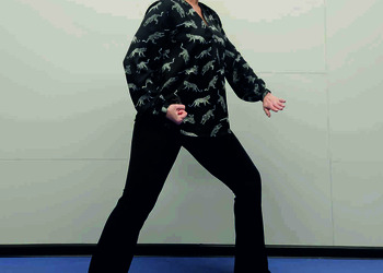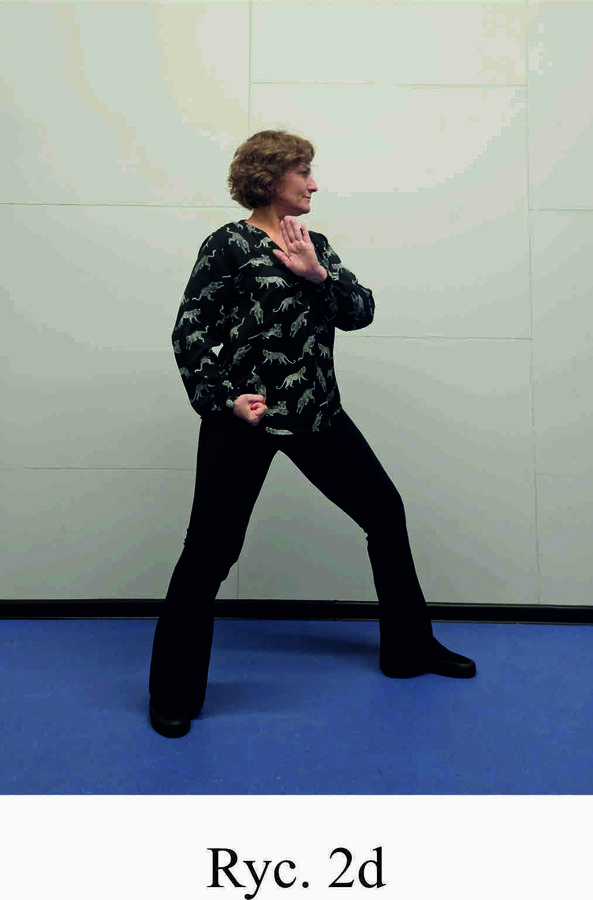 Pozycja Deng Shan Bu na lewą stronę – lewa noga z przodu, kolano zgięte, palce stopy skierowane na wprost, prawa noga z tyłu, kolano wyprostowane, palce stopy ustawione w przód w skos, rozłożenie ciężaru 60% na nodze wykrocznej, 40% na nodze zakrocznej, tułów wyprostowany, lewa ręka z boku ciała, ułożona grzbietem do środka i palcami w przód, prawa ręka zaciśnięta w pięść, skierowana w przód w skos (Ryc. 2a i 2b). Przejście do pozycji Si Liu Bu poprzez lekki skręt bioder w prawo i przeniesienie ciężaru w tył z równoczesnym ściągnięciem prawej pięści skierowanej wnętrzem w górę do biodra i ułożeniem lewej ręki przy prawym barku z otwartą dłonią skierowaną wnętrzem w prawo i palcami do góry (Ryc. 2c i 2d). Następnie blok lewą ręką nad kolanem i przesunięcie ręki w bok (Ryc. 2e i 2f) oraz wykonanie uderzenia prawą ręką w brzuch z przejściem do pozycji wyjściowej (Ryc. 2a i 2b). Powtórzyć 10 razy na obie strony.