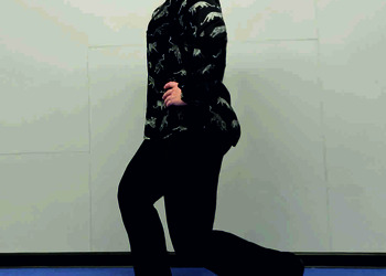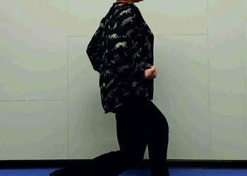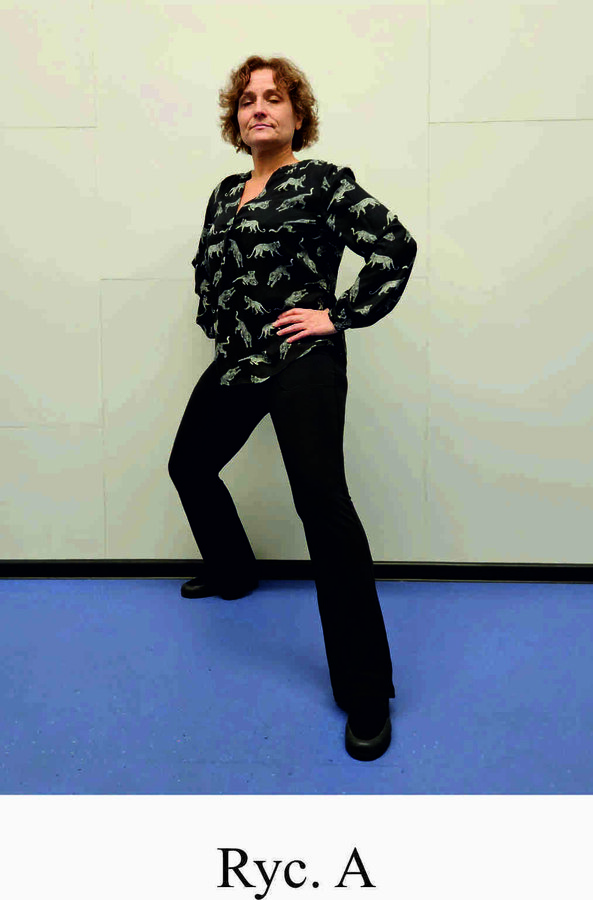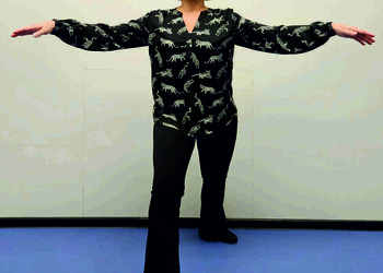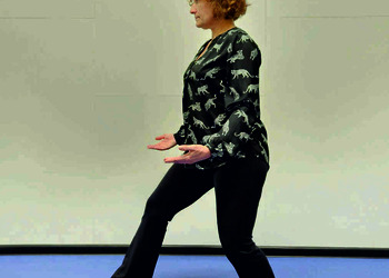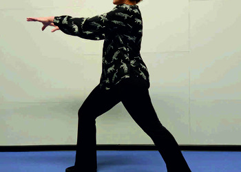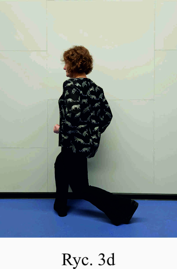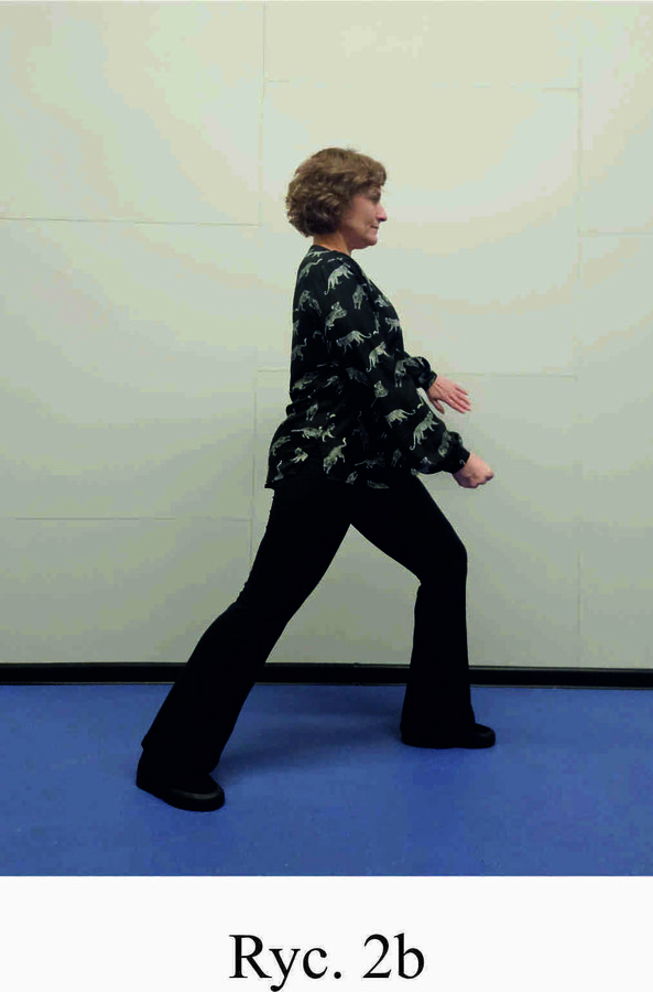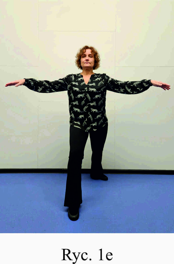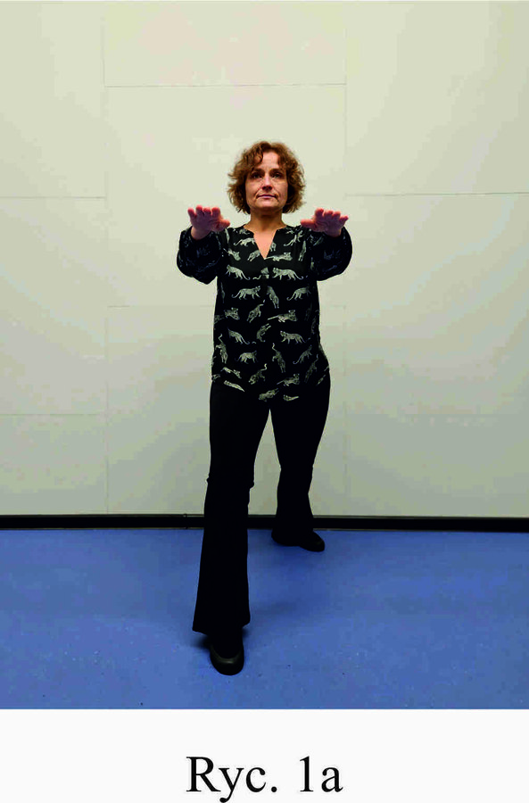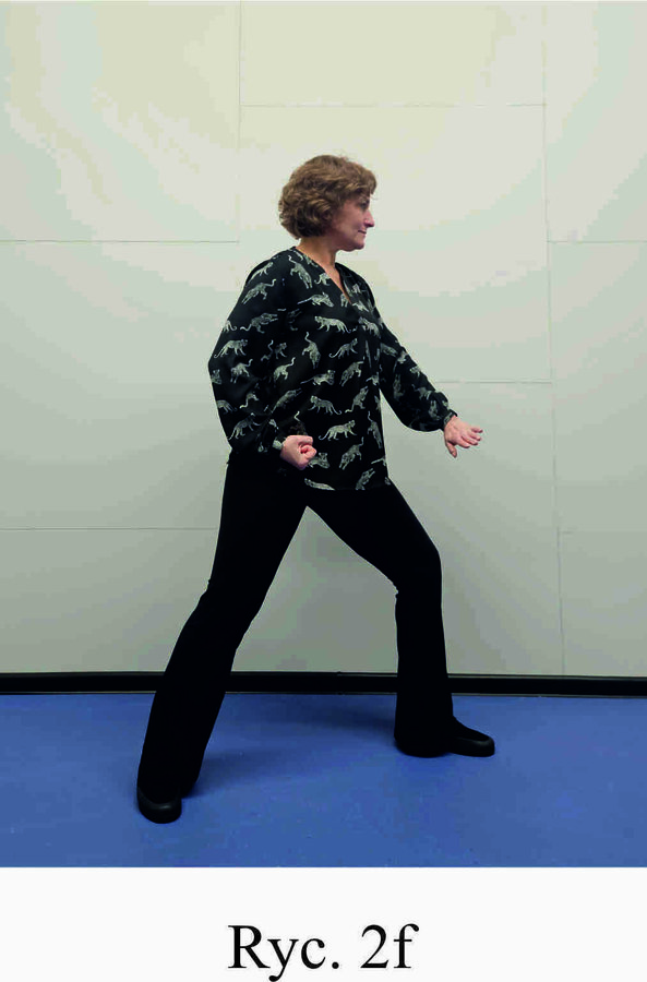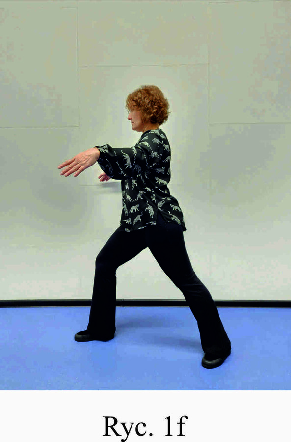 Pozycja Deng Shan Bu na prawą stronę – prawa noga, zgięta w kolanie z przodu, ze stopą ustawioną palcami na wprost, lewa noga z wyprostowanym kolanem z tyłu, z palcami skierowanymi w przód w skos, 60% ciężaru ciała na nodze wykrocznej, 40% na nodze zakrocznej, tułów prostopadle do podłoża, ręce wyciągnięte w przód, ustawione równolegle do podłoża (Ryc. 1a i 1b). Przejście do pozycji Si Liu Bu poprzez przeniesienie ciężaru ciała na nogę zakroczną i otwarcie bioder w lewo, ręce opadają w dół z jednoczesnym ustawieniem dłoni wewnętrzną stroną w górę (Ryc. 1c i 1d). Uniesienie i przeniesienie ramion bokiem w przód z ponownym odwróceniem dłoni grzbietem w górę (Ryc. 1e i 1f) i skierowanie ich do przodu z równoczesnym powrotem do pozycji Deng Shan Bu (Ryc. 1a i 1b). Powtórzyć 10 razy, zmienić stronę i wykonać kolejne 10 powtórzeń.