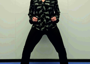 Pozycja wyjściowa i ruch jak w ćw. 3, tylko z pozycji skrzyżnej powrót do pozycji Ma Bu podskokiem - odbicie z obu nóg, obrót ciała w powietrzu i lądowanie na dwie nogi z równym rozłożeniem ciężaru. Powtórzyć 10 razy na każdą stronę.